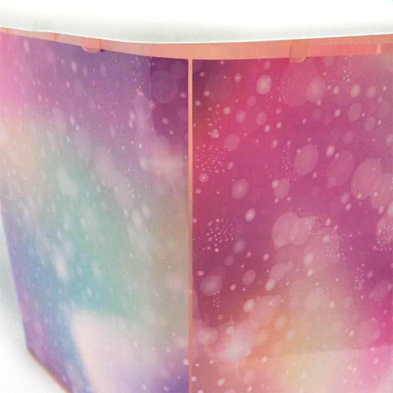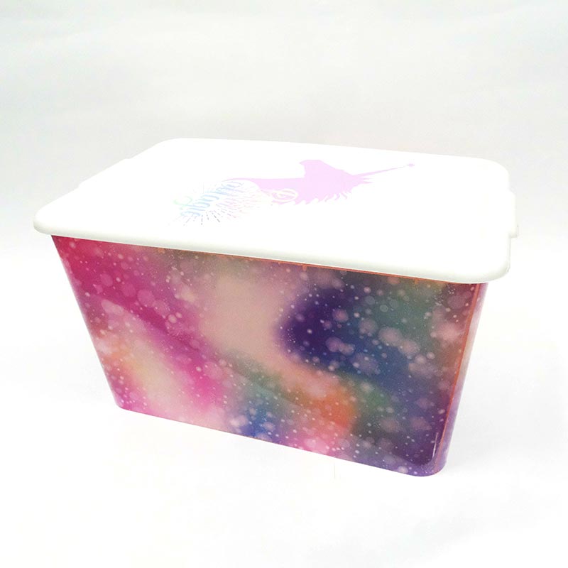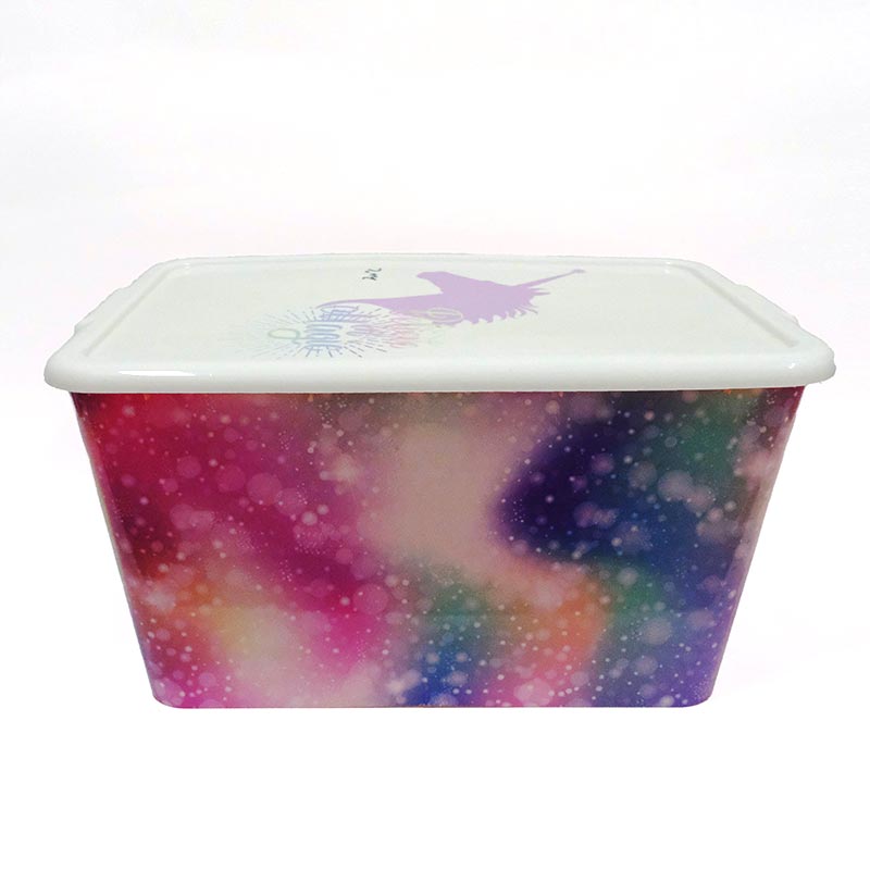 This in-mold label product has already been put on the sales market in the European and American home furnishing sectors. TheStorage Bin Injection Molding In Mold Label is centered around the element of dreamy starry sky. It is made using the CMYK process to form a gradient rainbow color, and is combined with special textures to create the effect of star-shaped bubbles. The lid label is based on the design of the rainbow unicorn, making the label style more refreshing.