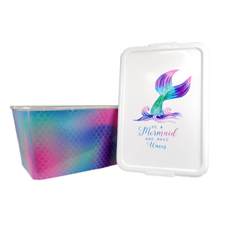 YZY has used advanced technology and production processes to achieve a gradient rainbow-colored fish scale pattern effect on thisStorage organizer Injection Molding In Mold Label. On the other hand, it is paired with a hand-drawn illustration of the mermaid tail by the client. The label not only enhances the brand recognition and aesthetic appeal of the customer's storage box but also meets the modern consumers' demand for durable home products through the injection-molded one-piece forming process. In terms of visual design, the Storage organizer Injection Molding In Mold Label adopts a dual-sided differentiated style. The entire storage box is mainly designed with a gradient rainbow-colored fish scale pattern. The CMYK four-color natural overlay creates a laser effect, reflecting a rich color layering under different light conditions. With its unique visual appeal and durable quality, it can stand out among similar products.